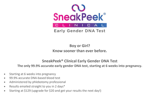 While every person has her own DNA in her bloodstream, a pregnant woman’s bloodstream also contains DNA from her unborn child. SneakPeek looks for male chromosomes in a small sample of your blood. If male chromosomes are found, that means baby is a boy. If none are found, ba by is a girl. SneakPeek is 99.9% accurate at 6 weeks into pregnancy.